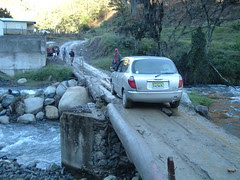 After Manabao, the road got significantly worse – a pitted and steep one-and-a-half-lane dirt path. We came to a rushing river whose only crossing was a singularly frightening one-lane brdge constructed of logs and mud, narrow and with no railing. Much of the mud had washed off of one side of the bridge, leaving open ruts between the logs. The jeep crossed it fine, but it was scarier in the passenger sedan we were traveling in with its narrow tires. Mom and I got out and walked across to lighten the load, while Luis and Gary guided driver Jorge slowly across. About 20 minutes later we arrived in La Cienaga, a village of 200 - the end of the road and the start of our hike.